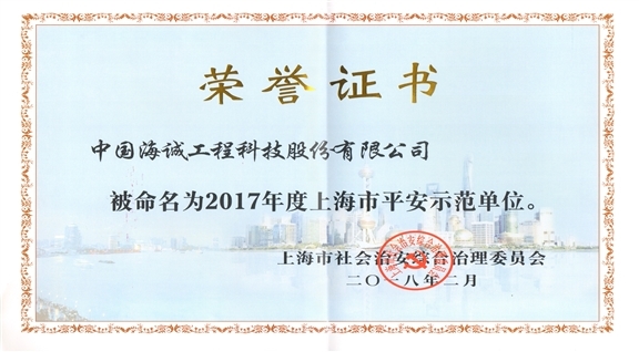 The other day, Shanghai Commission of Comprehensive Administration issued a circular to commend the units that had outstanding performance in the activity of safe and sound creation. Our company was rated as an "Operational Safety Demonstration Organization in Shanghai in 2017".