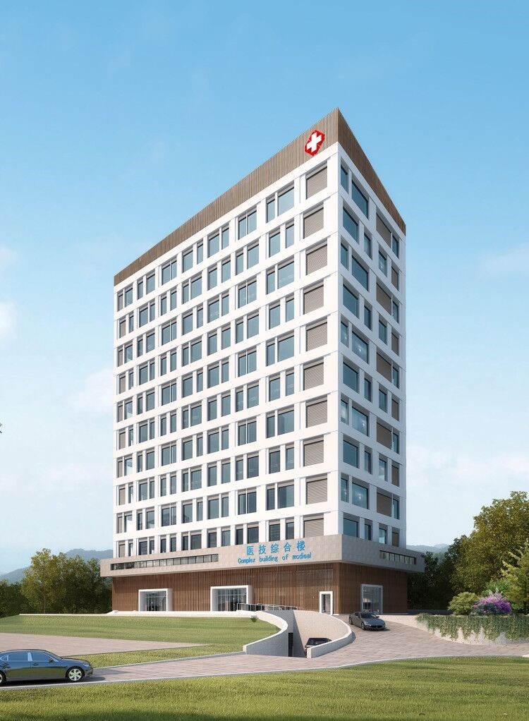 該項目占地面積1045.64㎡,總建筑面積14171.74㎡。項目規(guī)劃著重于生態(tài)環(huán)境與高科技醫(yī)療建筑形象的研究,將建筑與環(huán)境景觀緊密融合,充分體現(xiàn)醫(yī)技“值得信任的高科技”的個性特點。該項目擬建場地為山地地形前后高差較大,消防環(huán)道坡度為11%,致使道路陡度高。為解決由此帶來的院區(qū)推床與病人行走困難問題,使各類綜合因素配合度更高,設計團隊經(jīng)過多次現(xiàn)場實地考察和多方案比對研究,最終利用高差劣勢轉(zhuǎn)成預留下沉景觀廣場優(yōu)勢,同時使用雙首層設計手法,使背面道路可直接通過建筑內(nèi)一層與二層之間的電梯空間快速到達。