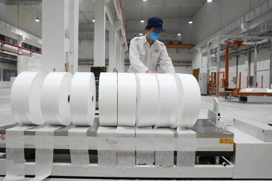 項(xiàng)目引進(jìn)美國(guó)進(jìn)口孖紡生產(chǎn)線(xiàn),生產(chǎn)50~200gsm克重產(chǎn)品,運(yùn)行車(chē)速為250m/min,年生產(chǎn)能力為8000~9000噸,是亞洲第一條孖紡高分子吸附新材料生產(chǎn)線(xiàn)。生產(chǎn)的孖紡產(chǎn)品可廣泛應(yīng)用于口罩、防護(hù)服、手術(shù)墊、護(hù)理墊、洞巾等醫(yī)療防護(hù)用品的過(guò)濾芯層,以及高檔濕巾、隔音隔熱材料等領(lǐng)域。