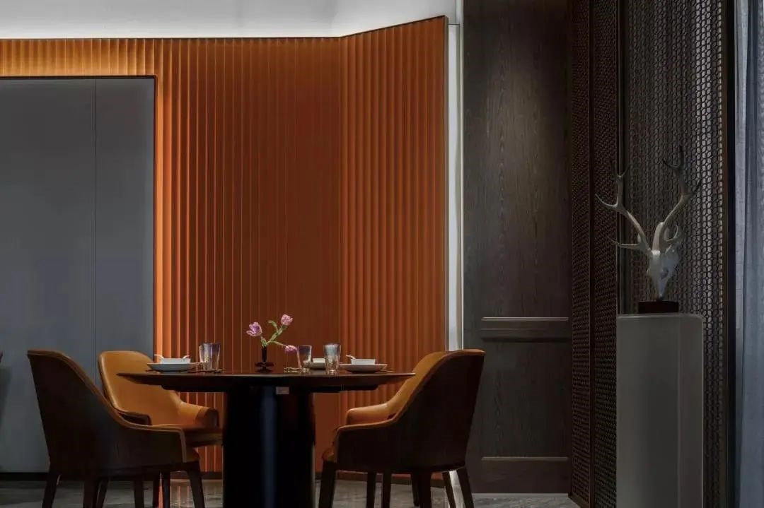 不同的空間其形式與意蘊(yùn)就會(huì)有所不同,來(lái)到走廊公區(qū),京紅色與明黃色的點(diǎn)綴在整個(gè)空間中尤為亮眼,驚艷了來(lái)此就餐的客人,并感受著帝都的文化內(nèi)涵。餐廳的包間區(qū)主要分布于二層,設(shè)計(jì)師希望為客人營(yíng)造安靜舒適的就餐私密環(huán)境。既通透又私密的金屬隔斷設(shè)計(jì)手法將兩處包間劃分兩側(cè),可分可合的滿足不同的宴會(huì)需求,遮擋后可做單獨(dú)包間使用,敞開(kāi)又可做大包間使用,原木色柜體與白凈的墻面將空間定格為靜與動(dòng)的氛圍感受,墻面搭配冷暖跳色加以裝飾,氣韻中和,寧?kù)o致遠(yuǎn)。