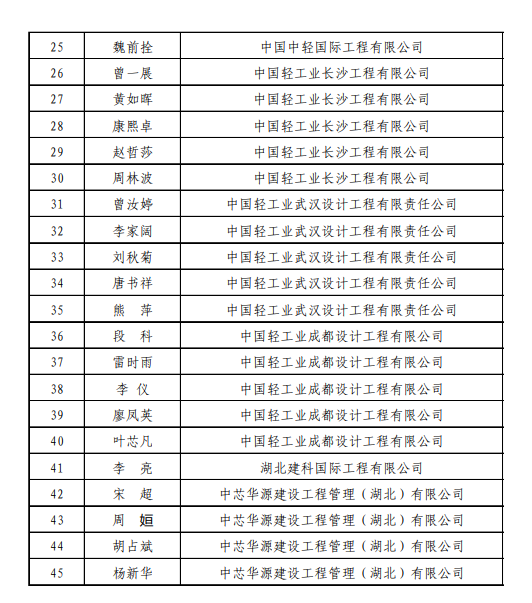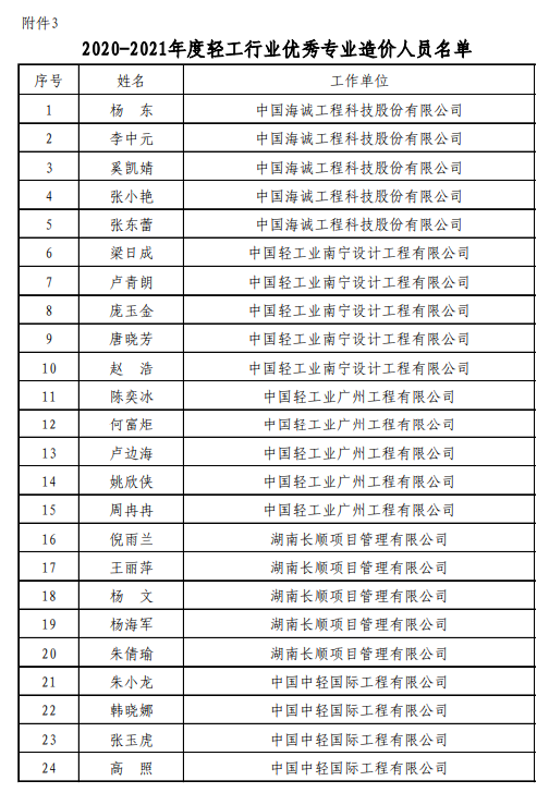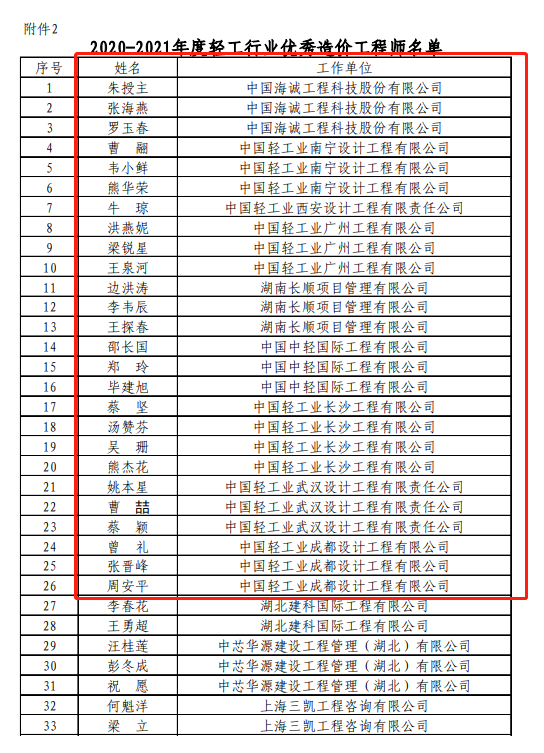 日前,中國輕工業(yè)工程建設協會公布了“2020-2021年度輕工行業(yè)優(yōu)秀造價咨詢企業(yè)和優(yōu)秀造價工程師(專業(yè))評價結果”,中國海誠及所屬廣州公司、武漢公司、南寧公司、成都公司、西安公司、北京公司、湖南長順均榮膺“輕工行業(yè)優(yōu)秀工程造價咨詢企業(yè)”稱號,同時公司26名員工被評為“優(yōu)秀造價工程師(共33名)”,40名員工被評為“優(yōu)秀專業(yè)造價人員(共45名)”。
