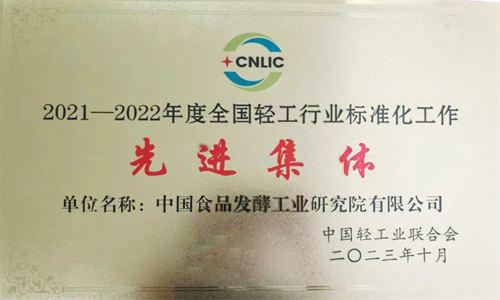 中國食品發(fā)酵工業(yè)研究院榮獲“2021-2022年度全國輕工行業(yè)標準化工作先進集體”稱號。