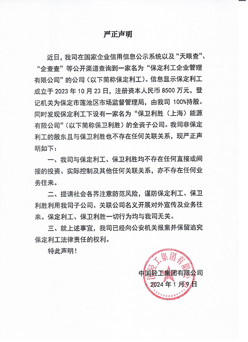 近日,我司在國家企業(yè)信用信息公示系統(tǒng)以及“天眼查”、“企查查”等公開渠道查詢到一家名為“保定利工企業(yè)管理有限公司”的公司(以下簡稱保定利工)。信息顯示保定利工成立于2023年10月23日,注冊資本人民幣8500萬元,登記機關為保定市蓮池區(qū)市場監(jiān)督管理局,由我司100%持股。同時發(fā)現(xiàn)保定利工下設有一家名為“保衛(wèi)利勝(上海)能源有限公司”(以下簡稱保衛(wèi)利勝)的全資子公司。我司非保定利工的股東且與保衛(wèi)利勝也不存在任何關聯(lián)關系,現(xiàn)嚴正聲明如下: