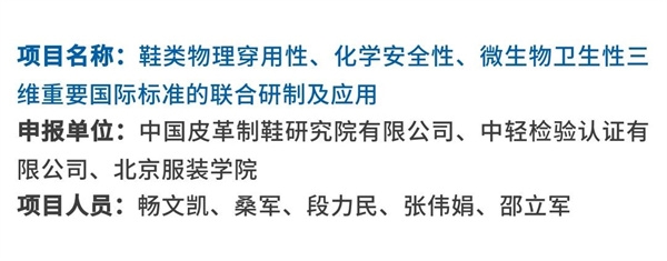 中國(guó)皮革制鞋院聯(lián)合申報(bào)的“鞋類物理穿用性、化學(xué)安全性、微生物衛(wèi)生性三維重要國(guó)際標(biāo)準(zhǔn)的聯(lián)合研制及應(yīng)用”項(xiàng)目,主導(dǎo)制定的國(guó)際標(biāo)準(zhǔn)ISO19574、ISO20535和ISO19577,打破多年來(lái)歐盟成員國(guó)技術(shù)壟斷,實(shí)現(xiàn)我國(guó)在鞋類微生物、物理和化學(xué)領(lǐng)域國(guó)際標(biāo)準(zhǔn)的突破,填補(bǔ)物理和化學(xué)檢測(cè)方法標(biāo)準(zhǔn)的國(guó)際空白。