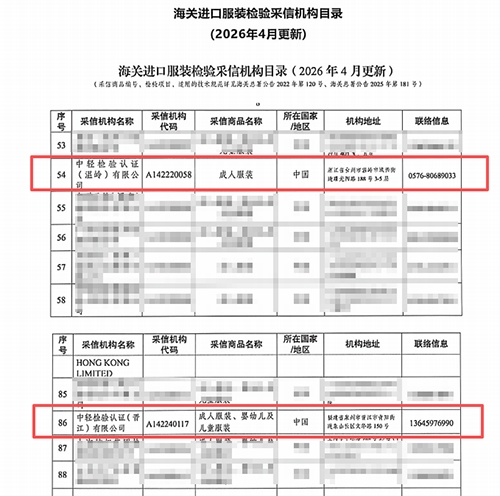 近日,中輕檢驗(yàn)認(rèn)證(晉江)有限公司、中輕檢驗(yàn)認(rèn)證(浙江)有限公司(原名:中輕檢驗(yàn)認(rèn)證〔溫嶺〕有限公司)均成功入選國(guó)家海關(guān)總署《海關(guān)進(jìn)口服裝檢驗(yàn)采信機(jī)構(gòu)目錄》。這充分體現(xiàn)國(guó)家權(quán)威部門(mén)對(duì)中輕檢驗(yàn)技術(shù)實(shí)力與服務(wù)水平的高度認(rèn)可,彰顯其在輕工紡織檢測(cè)領(lǐng)域?qū)I(yè)優(yōu)勢(shì)與行業(yè)影響力。