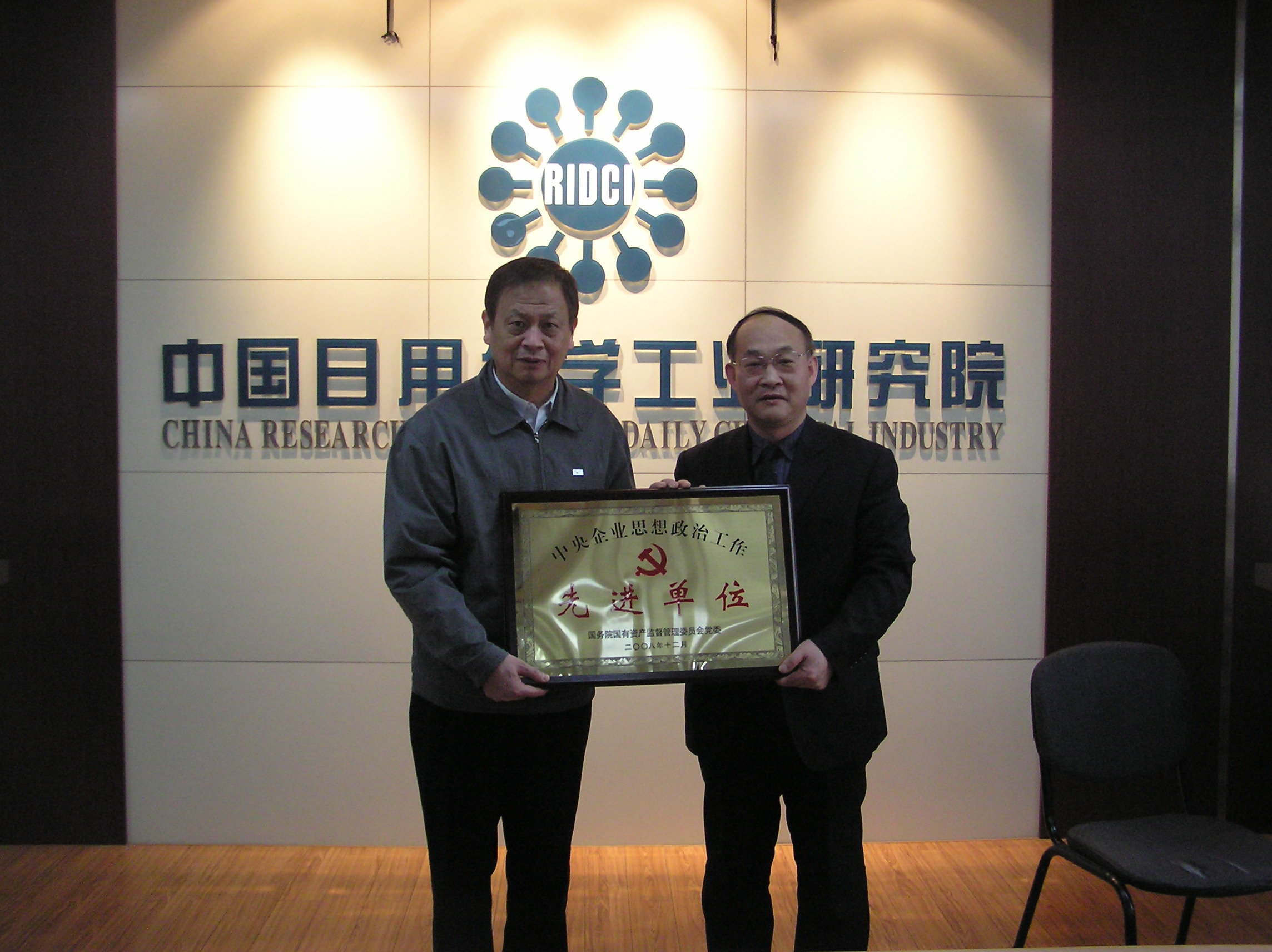 2009年,中國(guó)日用化學(xué)工業(yè)研究院榮獲國(guó)務(wù)院國(guó)資委委表彰的中央企業(yè)思想政治工作先進(jìn)單位。2010年2月24日,集團(tuán)公司黨委副書(shū)記、紀(jì)委書(shū)記梁江東同志到中國(guó)日用化學(xué)工業(yè)研究院開(kāi)展工作,代表集團(tuán)公司黨委給中國(guó)日用化學(xué)工業(yè)研究院頒發(fā)了中央企業(yè)思想政治工作先進(jìn)單位獎(jiǎng)牌。
