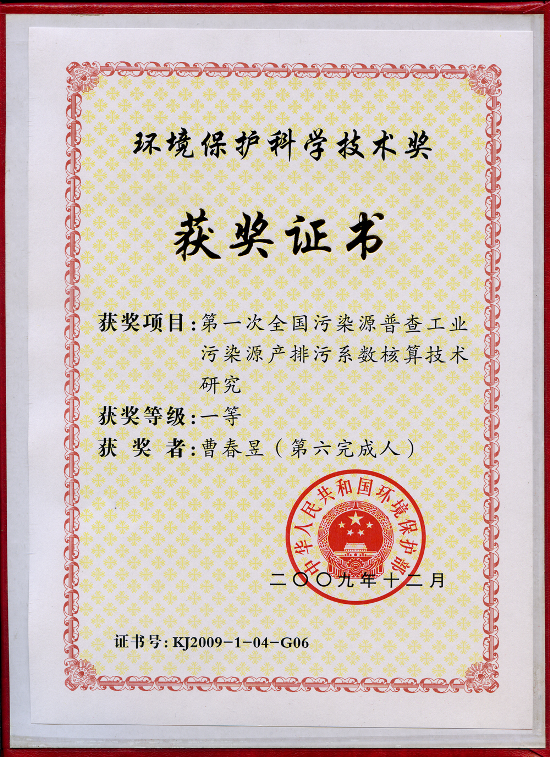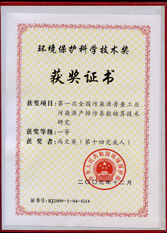 中國制漿造紙研究院教授級(jí)高工曹春昱和高工馮文英參與的《第一次全國污染源普查工業(yè)污染源產(chǎn)排污系數(shù)核算技術(shù)研究》項(xiàng)目獲國家環(huán)保部2009年度環(huán)境保護(hù)科學(xué)技術(shù)獎(jiǎng)一等獎(jiǎng)。