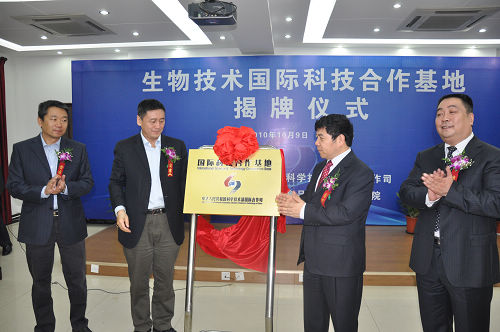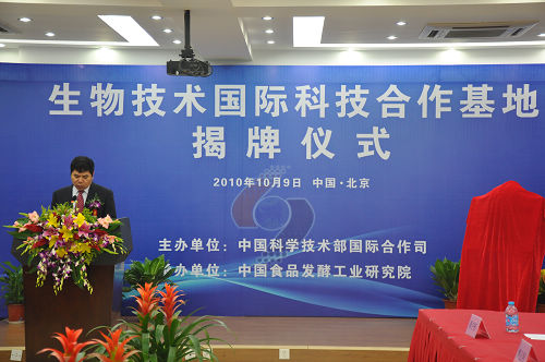 10月9日,科技部“生物技術(shù)國(guó)際科技合作基地” 揭牌儀式在集團(tuán)食品發(fā)酵院隆重舉行??萍疾繃?guó)際合作司靳曉明司長(zhǎng)、綜合與計(jì)劃處張健處長(zhǎng)、集團(tuán)陳鄂生董事長(zhǎng)、食品發(fā)酵院蔡木易院長(zhǎng)等出席了此次揭牌儀式。靳曉明司長(zhǎng)和陳鄂生董事長(zhǎng)共同為生物技術(shù)國(guó)際科技合作基地揭牌。