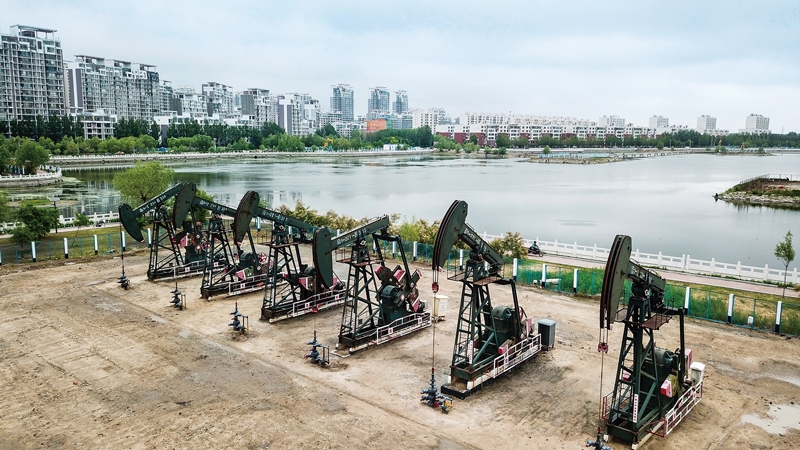 經(jīng)過(guò)半個(gè)多世紀(jì)艱苦創(chuàng)業(yè),大慶油田不僅扛起了“共和國(guó)加油機(jī)”的神圣職責(zé),為保障國(guó)家能源安全作出巨大貢獻(xiàn),而且著力打造了一座人與自然和諧相處、原油生產(chǎn)與環(huán)境保護(hù)相得益彰的“綠色油化之都”。圖為大慶油田叢式井坐落在市區(qū)燕都湖旁。 新華社記者 王建威/攝