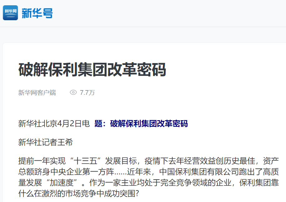 3月31日,國企改革典型宣傳保利專場媒體座談會召開。會上,保利集團(tuán)領(lǐng)導(dǎo)與人民日報、新華社、中央廣播電視總臺、光明日報、經(jīng)濟(jì)日報、中國日報等18家媒體單位的記者就保利集團(tuán)改革發(fā)展情況進(jìn)行座談。近日,新華社刊發(fā)專題文章,詳細(xì)介紹保利集團(tuán)改革密碼——