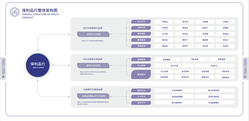 《保利品行-保利集團行為手冊》搭建卓越行為識別體系框架,明晰了全體保利人的卓越行為倡導(dǎo),以共同行為準(zhǔn)則、基本禮儀規(guī)范、關(guān)鍵品牌觸點行為支撐品行之樹,規(guī)范全體保利人的知與行。