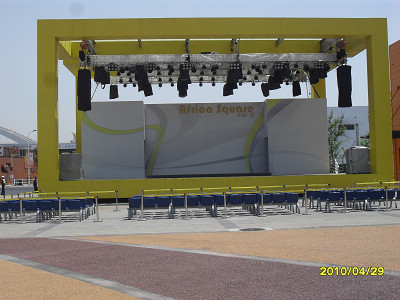 五大洲廣場為上海世博園區(qū)露天舞臺搭建工程,包括露天舞臺的輔助用房和露天舞臺,可舉辦各國各民族風(fēng)情歌舞表演、大型戶外音樂會、演唱會、街頭演藝活動等。固定舞臺,每個250平方米,工作區(qū)用房面積180平方米。建筑面積均為一層,舞臺面積約為360 m2,最高高度為10.0米。上部結(jié)構(gòu)形式為鋼結(jié)構(gòu)構(gòu)架,為世博園區(qū)臨時建筑。